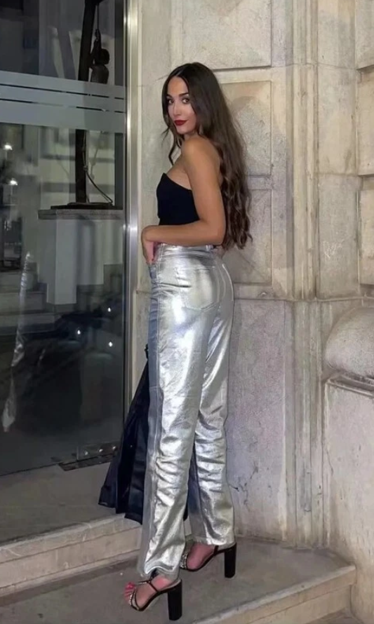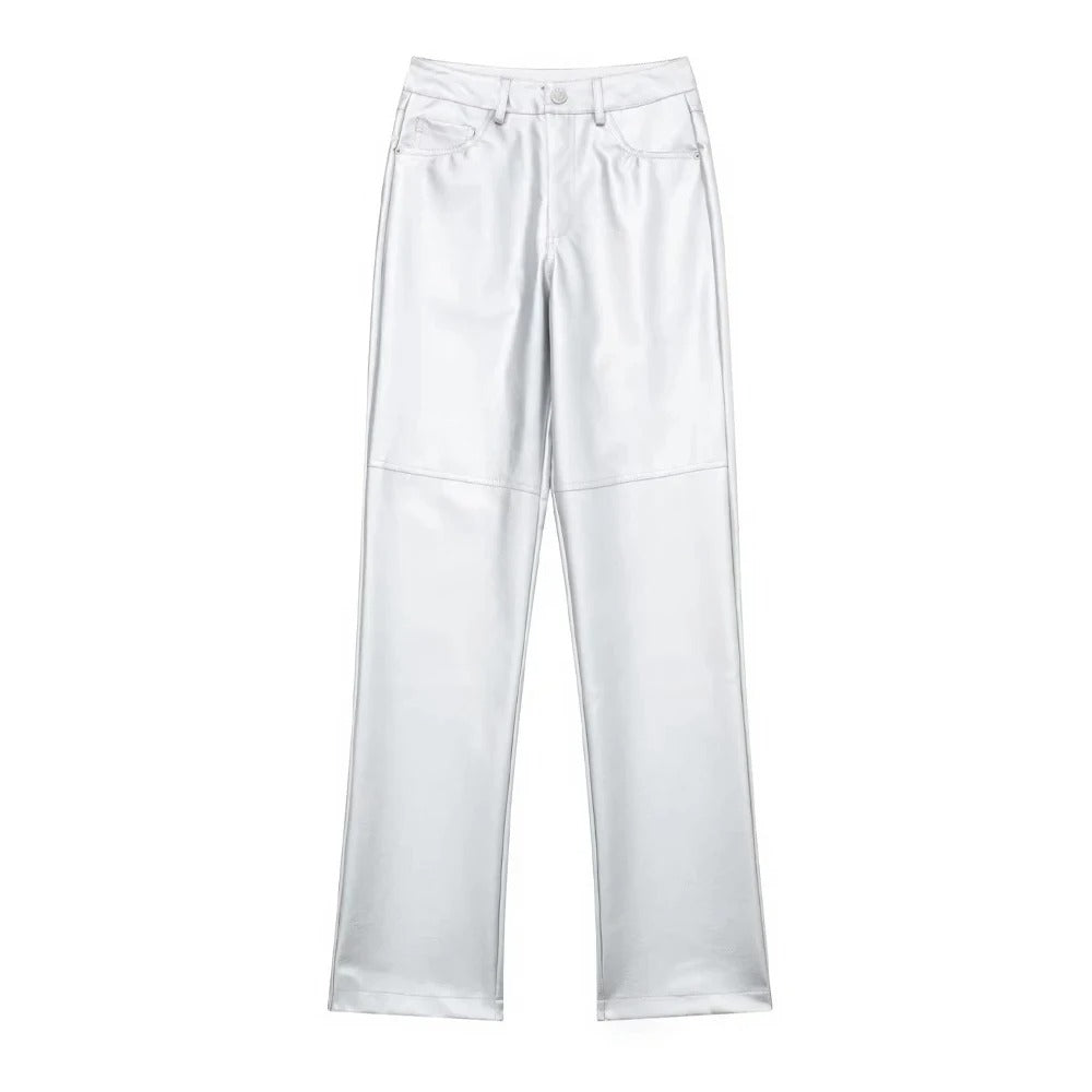 Lustra High-Waist-byxorna ger vardagen en touch av elegans och lyster. Med sin skimrande yta, höga midja och raka siluett skapar de en stilren och sofistikerad look. Det raka snittet gör att byxorna faller elegant, medan midjan framhäver figuren på ett smickrande sätt. Perfekta för både eleganta tillfällen och moderna statement-outfits som sticker ut.